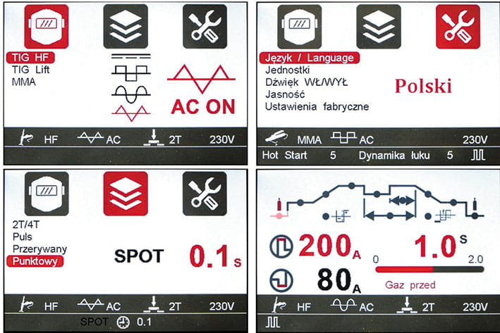 - Wybór metody spawania TIG AC, TIG DC, MMA, AC MMA, MMA PULS