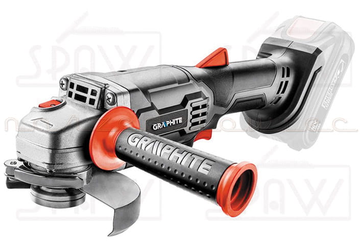 Szlifierka kątowa GRAPHITE, współpracująca z akumulatorami 18V Li-Ion GRAPHITE Energy+ jest narzędziem przeznaczonym do szlifowania i cięcia materiałow z metalu i kamienia bez użycia wody. Przystosowana do pracy z tarczami o średnicy 115 mm, osiąga prędkość 10000 obrotów na minutę. Szlifierkę wyposażono w dwuelementowy przycisk włącznika, zapewniający bezpieczeństwo i pełną kontrolę nad pracą urządzenia. Konstrukcja elektronarzędzia odznacza się wysoką ergonomią - przewężona część chwytowa została pokryta antypoślizgowym tworzywem, dzięki czemu szlifierka pewnie leży w dłoni. Dzięki płaskiej obudowie przekładni urządzeniem można pracować także w trudno dostępnych miejscach. Zabudowany przycisk blokady wrzeciona chroni użytkownika przed przypadkowym załączeniem blokady podczas pracy. Rozmieszczenie otworów wentylacyjnych poza strefą chwytu chroni silnik przed przegrzaniem. Regulacja położenia osłony tarczy odbywa się bez użycia narzędzi.