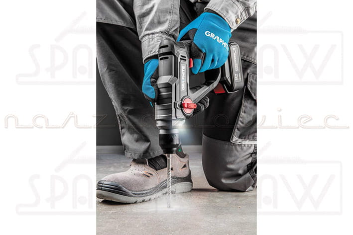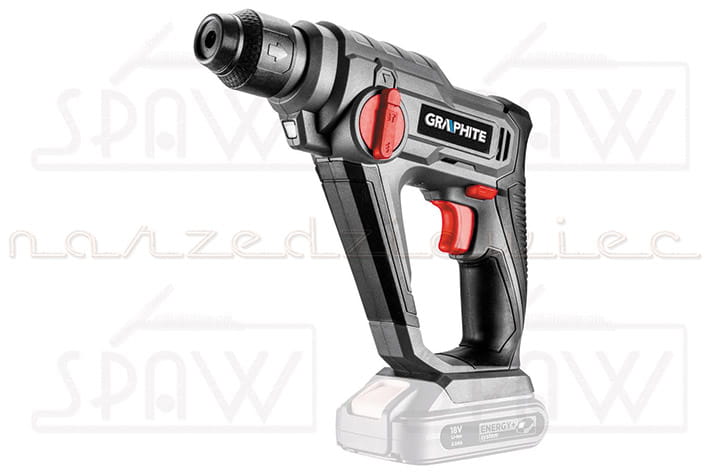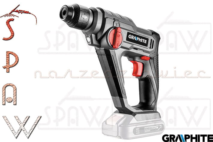 Młotowiertarka SDS+ GRAPHITE 58G009, współpracująca z akumulatorami 18V Li-Ion GRAPHITE Energy+. Posiada 2 funkcje: wiercenie oraz wiercenie z udarem elektro-pneumatycznym. Konstrukcja młotowiertarki odznacza się kompaktowym kształtem, zbliżonym do wymiarów wiertarko-wkrętarki oraz niską wagą. Elektronarzędzie zapewnia energię udaru 0.8J, optymalną także dla wiercenia w twardszych materiałach budowlanych. Częstotliwość udaru wynosi 0-5000 min⁻¹,a prędkość obrotowa 0-900 min⁻¹. Maksymalna średnica wiercenia w betonie wynosi 10 mm, w stali 8 mm, w drewnie 16mm. Młotowiertarka posiada możliwość zmiany kierunku obrotów wrzeciona oraz możliwość stopniowej regulacji prędkości za pomocą przycisku włącznika. Miejsce pracy jest doświetlane za pomocą diody LED. Młotowiertarka posiada funkcję "click" do szybkiego mocowania wiertła. Rękojeść główna pokryta jest antypoślizgową nakładką, dzięki czemu elektronarzędzie pewnie leży w dłoni.