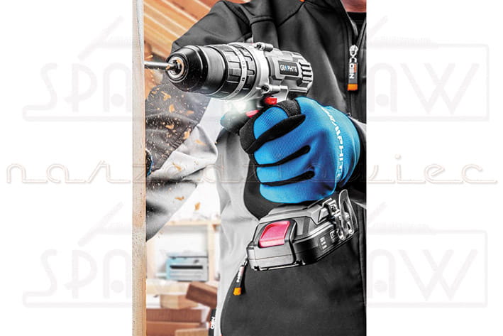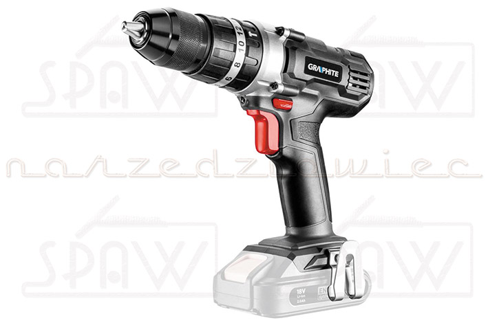 Dwubiegowa wiertarko-wkrętarka GRAPHITE z UDAREM, współpracująca z akumulatorami 18V Li-Ion GRAPHITE Energy+ jest narzędziem przeznaczonym do wiercenia otworów bądź wkręcania śrub oraz wkrętów w różnego rodzaju materiały. Elektronarzędzie posiada płynną regulację prędkości obrotowej oraz zostało wyposażone w przełącznik kierunku obrotów. Samozaciskowy uchwyt pozwala na stosowanie osprzętu o średnicy 2-13 mm. Maksymalna prędkość obrotowa wrzeciona na pierwszym biegu wynosi 350, a na drugim 1250 obrotów na minutę. Częstotliwość udaru mechanicznego na pierwszym biegu osiąga wartość 5250, a na drugim 18750 uderzeń na minutę. Maksymalny moment obrotowy wynosi 35 Nm (wkręcanie miękkie) / 55 Nm (twarde) i może być regulowany poprzez 16-stopniowe sprzęgło z dodatkowym szybkim przełącznikiem trybu pracy dla wkręcania, wiercenia i wiercenia z udarem. Urządzenie wyposażono w elektryczny hamulec silnika i automatyczną blokadę wrzeciona. Dioda LED, uruchamiana automatycznie, podświetla miejsce pracy. Ergonomiczny kształt rękojeści i zwarta konstrukcja wiertarko-wkrętarki pozwalają na wygodną pracę także w trudnych warunkach. Rękojeść została pokryta materiałem antypoślizgowym, dzięki czemu elektronarzędzie pewnie leży w dłoni. Przekładnia planetarna została wykonana z wysokogatunkowej stali.