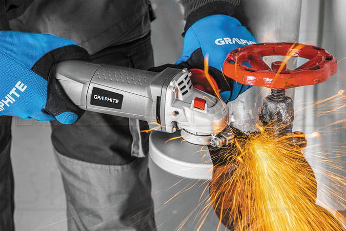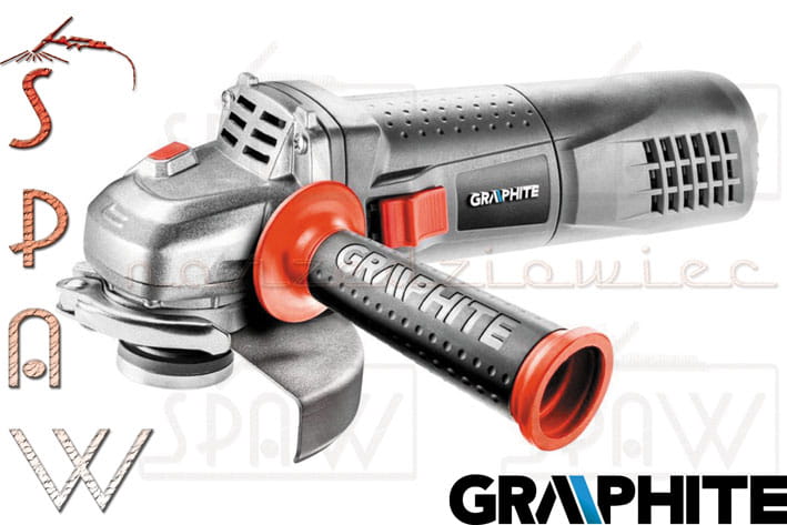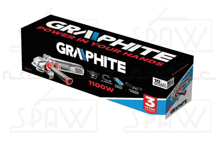 Szlifierka kątowa jest narzędziem przeznaczonym do szlifowania i cięcia materiałow z metalu i kamienia bez użycia wody. Wysokiej klasy szlifierka kątowa GRAPHITE (nr ref. 59G110) z silnikiem o mocy 1100W. Tarcza szlifierki o średnicy 125 mm. Urządzenie dzięki ergonomicznemu kształtowi oraz dokładnemu wyważeniu zapewnia wysoki komfort pracy. Istnieje możliwość dwupozycyjnego mocowania rękojeści bocznej. Szlifierka dla bezpieczeństwa została wyposażona w dwustopniowy włącznik z blokadą przypadkowego włączenia oraz zabezpieczony przed przypadkowym wciśnięciem przycisk blokady wrzeciona. Odpowiednie rozmieszczenie otworów wentylacyjnych zapewnia wydajne chłodzenie silnika. Maksymalna prędkość obrotowa głowicy wynosi 11000 obrotów na minutę. Urządzenie wyposażono w elastyczny i wytrzymały przewód zasilający w powłoce gumowej o długości 3m, dedykowany także do zastosowań profesjonalnych i przemysłowych zarówno wewnątrz jak i na zewnątrz pomieszczeń. Zgodność z europejskimi standardami zapewnia certyfikat CE.