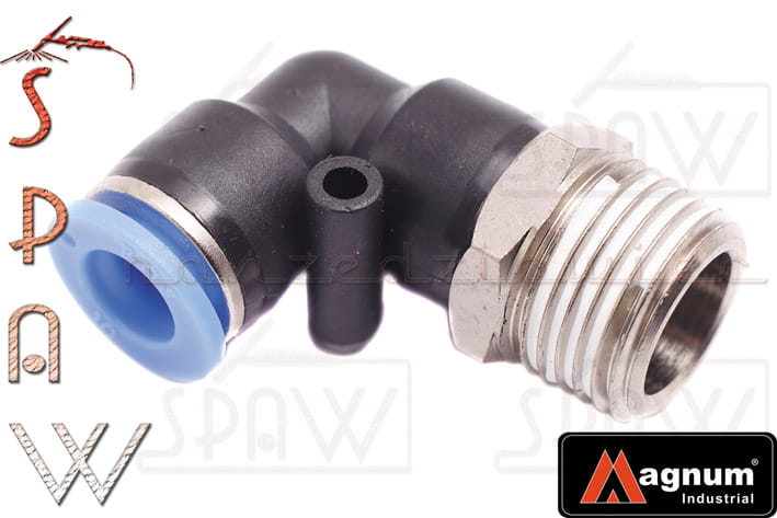 Kolanko - złączka wtykowa kątowa typu łącznik przelotowy do instalacji pneumatycznych pozwala na proste i szybkie łączenie przewodów pneumatycznych. Złączka wysokiej jakości. Produkt marki MAGNUM