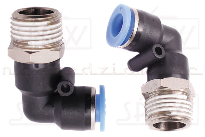 Złączka wtykowa kątowa - KOLANO - typu QUICK gwint zewnętrzny 1/4" na wąż 8mm.