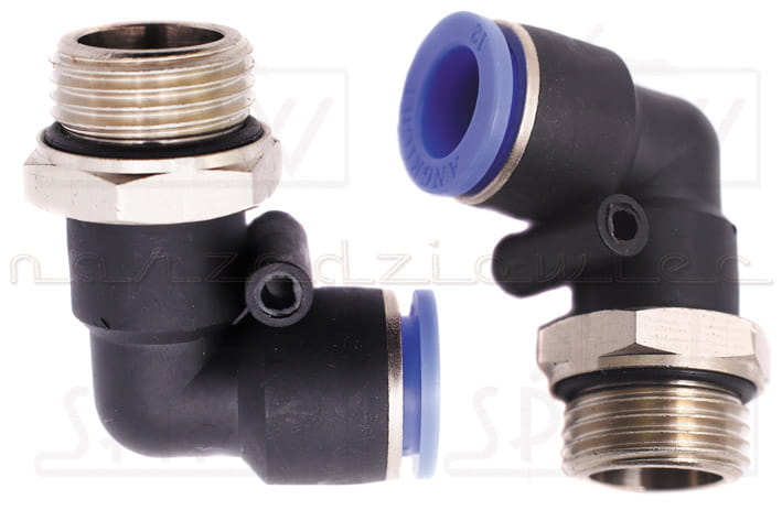 Złączka wtykowa kątowa - KOLANO - typu QUICK gwint zewnętrzny 1/4" na wąż 8mm.