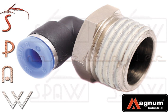 Kolanko - złączka wtykowa kątowa typu łącznik przelotowy do instalacji pneumatycznych pozwala na proste i szybkie łączenie przewodów pneumatycznych. Złączka wysokiej jakości. Produkt marki MAGNUM