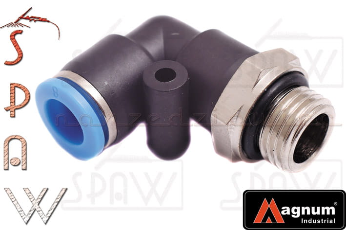 Kolanko - złączka wtykowa kątowa typu łącznik przelotowy do instalacji pneumatycznych pozwala na proste i szybkie łączenie przewodów pneumatycznych. Złączka wysokiej jakości. Produkt marki MAGNUM