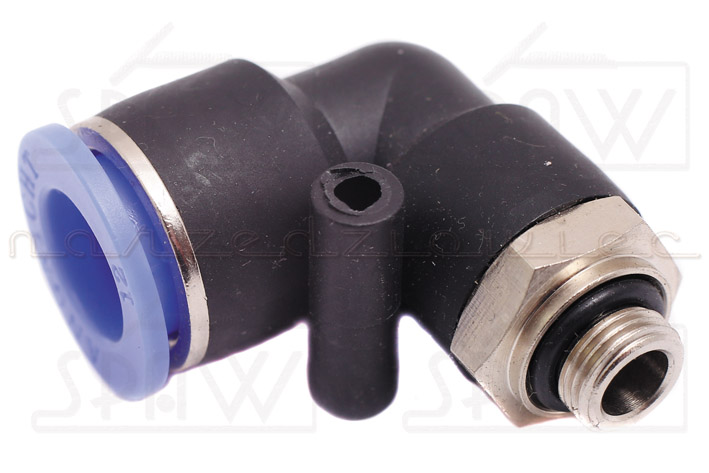 Złączka wtykowa kątowa - KOLANO - typu QUICK gwint zewnętrzny 1/4" na wąż 8mm.