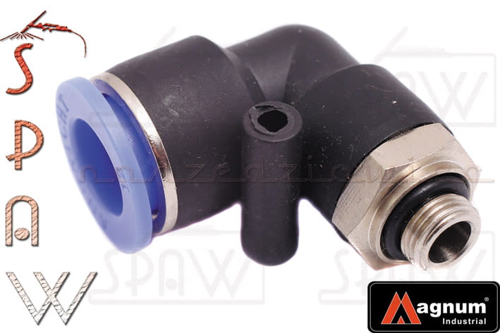 Kolanko - złączka wtykowa kątowa typu łącznik przelotowy do instalacji pneumatycznych pozwala na proste i szybkie łączenie przewodów pneumatycznych. Złączka wysokiej jakości. Produkt marki MAGNUM