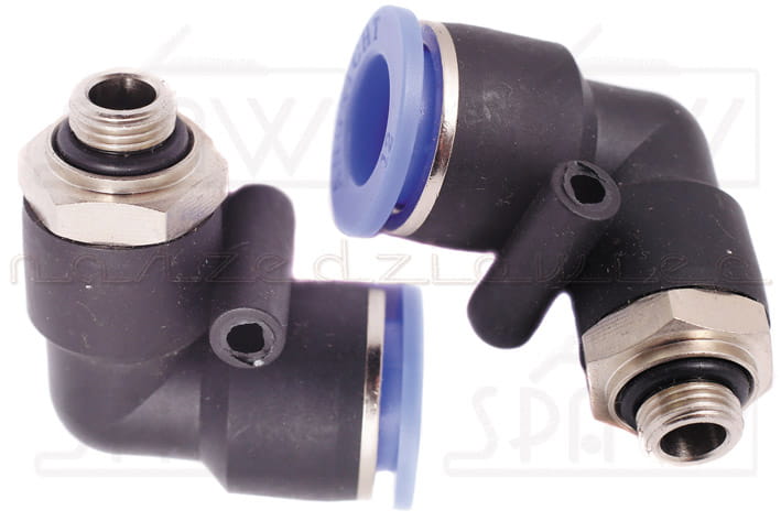 Złączka wtykowa kątowa - KOLANO - typu QUICK gwint zewnętrzny 1/8" na wąż 10mm.