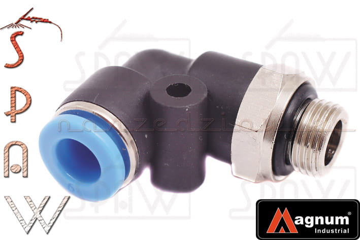 Kolanko - złączka wtykowa kątowa typu łącznik przelotowy do instalacji pneumatycznych pozwala na proste i szybkie łączenie przewodów pneumatycznych. Złączka wysokiej jakości. Produkt marki MAGNUM