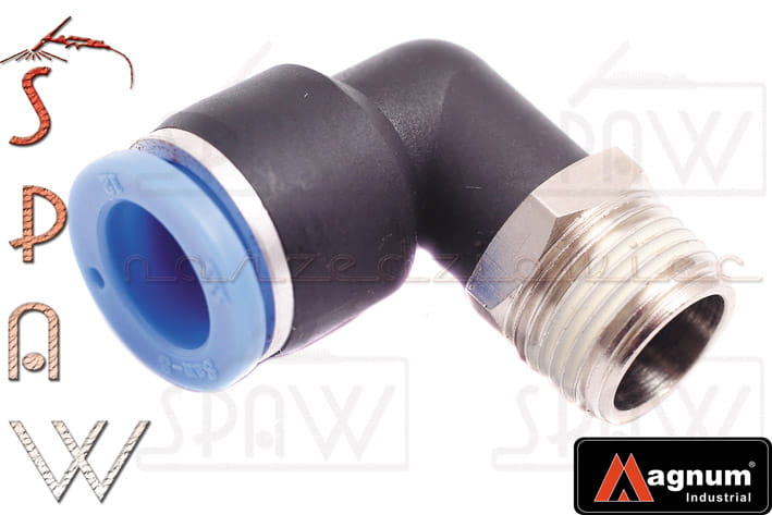 Kolanko - złączka wtykowa kątowa typu łącznik przelotowy do instalacji pneumatycznych pozwala na proste i szybkie łączenie przewodów pneumatycznych. Złączka wysokiej jakości. Produkt marki MAGNUM