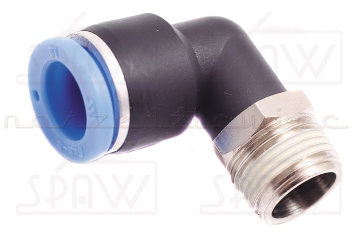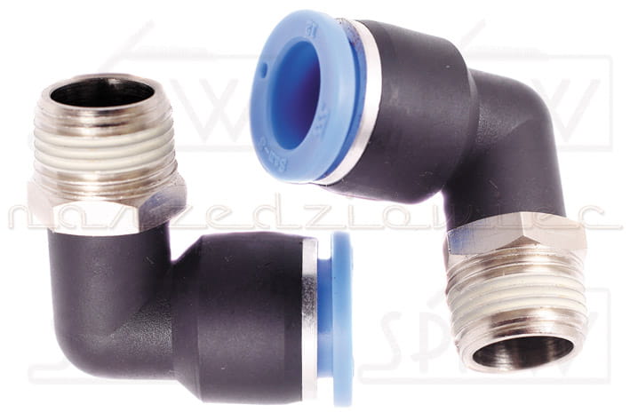 Złączka wtykowa kątowa - KOLANO - typu QUICK gwint zewnętrzny 1/4" na wąż 6mm.