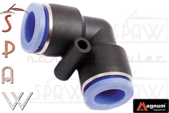 Kolanko - złączka wtykowa kątowa typu łącznik przelotowy do instalacji pneumatycznych pozwala na proste i szybkie łączenie przewodów pneumatycznych. Złączka wysokiej jakości. Produkt marki MAGNUM