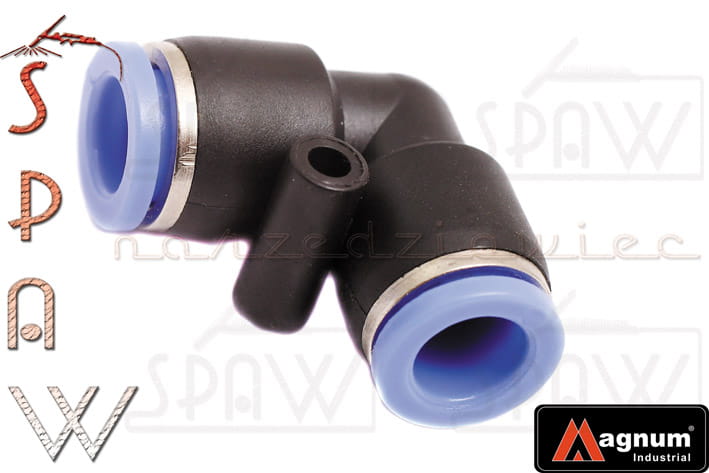 Kolanko - złączka wtykowa kątowa typu łącznik przelotowy do instalacji pneumatycznych pozwala na proste i szybkie łączenie przewodów pneumatycznych. Złączka wysokiej jakości. Produkt marki MAGNUM