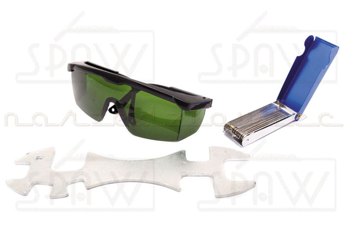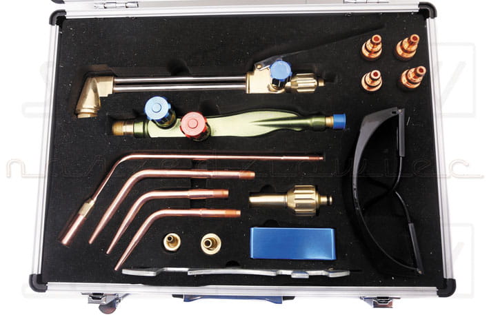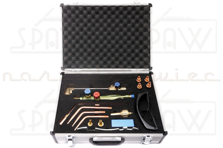 - W zestawie z nasadkami do spawania, dyszami do cięcia, zestawem przetyczek, kluczem, mikserem, okularami