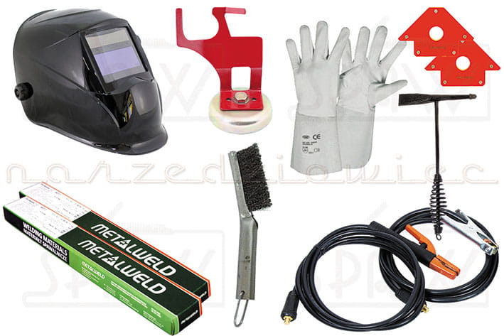 - W bogatym zestawie z różnymi akcesoriami spawalniczymi i automatyczną przyłbicą spawalniczą