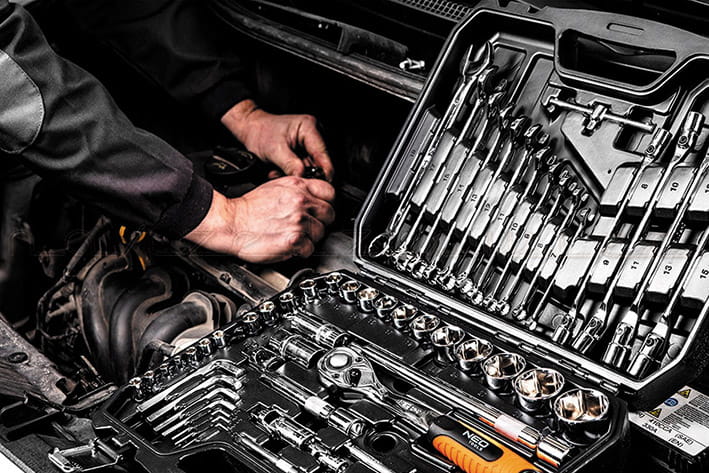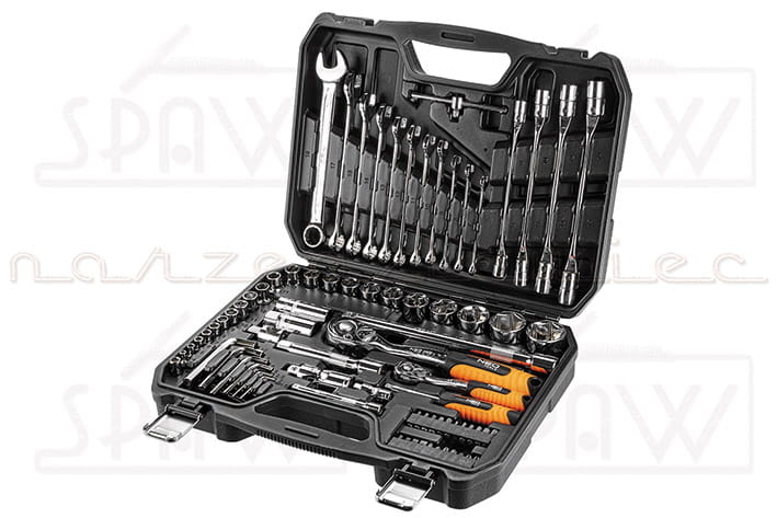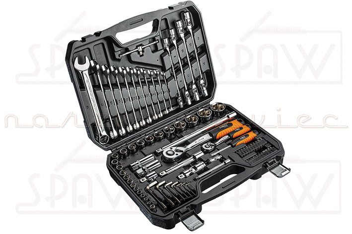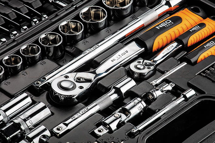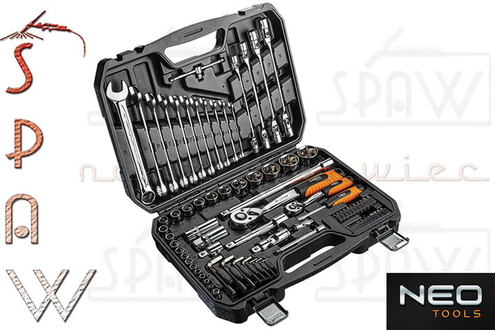 - Zestaw kluczy nasadowych, płasko-oczkowych i bitów NEO