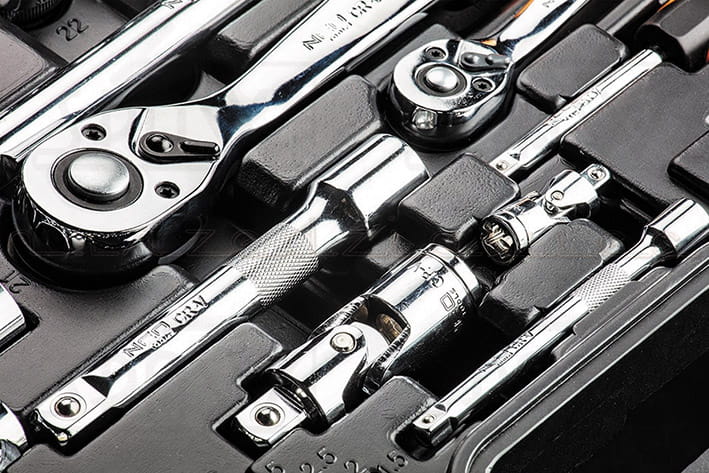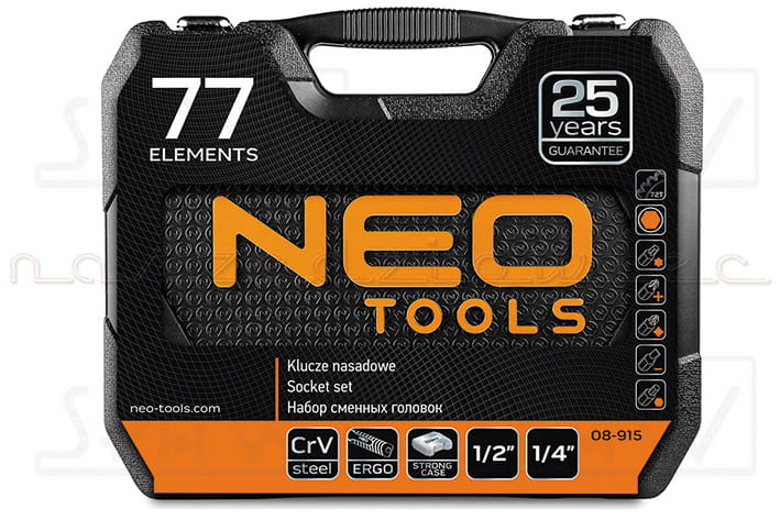 Zestaw kluczy nasadowych 1/4", 1/2" NEO to idealny zestaw kluczy nasadowych do zastosowań mechanicznych. 77 elementów to wystarczająco dużo, aby znaleźć mnóstwo zastosowań dla tego zestawu. 2 rozmiary grzechotek i osprzętu dają nam szerokie możliwości zastosowań. Rozmiar 1/2” to możliwość używania dużych sił, z opornymi śrubami możemy walczyć nie tylko samą grzechotką, ale też pokrętłem zrobionym z adaptera. Rozmiar 1/4” to możliwość stosowania tam gdzie nic innego się nie zmieści. Każdy rozmiar ma w zestawie precyzyjną grzechotkę o 72 zębach (skok 5o), zestaw nasadek sześciokątnych, przedłużki i przeguby – to jest podstawa. To na co warto zwrócić szczególną uwagę w zawartości tego zestawu to: - nasadki do świec + przeguby + przedłużki + grzechotki = możliwość odkręcenia świec, nawet tych umieszczonych głęboko w pochylonym do tyłu bloku silnika; - uchwyt wkrętakowy 1/4” wygląda zwyczajnie ale w rękojeści mamy dodatkowe gniazdo 1/4” co pozwala stosować go jako przedłużkę z dodatkowym uchwytem do precyzyjnego prowadzenia. Jeśli dołożymy do tego zestaw bitów z przejściówką i gamę nasadek 1/4” i pokrętło typu T, to praktycznie wszystko da się rozkręcić; - doskonałe uzupełnienie to klucze płasko oczkowe, które oprócz odkręcania i dokręcania śrub, doskonale się sprawdzą jako wsparcie przy pracy grzechotką do przytrzymania śruby lub nakrętki z drugiej strony połączenia; - klucze nasadowe-przegubowe – do szybkiego odkręcania śrub bez potrzeby zdejmowania klucza ze śruby i także jako wsparcie przy pracy grzechotką; - Ilość elementów pozwala na tysiące kombinacji i praktycznie tylko wyobraźnia ogranicza możliwości. Wszystkie nasadki, grzechotki i klucze wykonane są z wysokowytrzymałej stali chromowo-wanadowej (Cr-V). Wszystkie końcówki wkrętakowe wykonane ze stali narzędziowej S2. Całość w odpowiednio dopasowanej, mocnej walizce z metalowymi zatrzaskami. 25 lat gwarancji to potwierdzenie niezawodności i solidności elementów.
